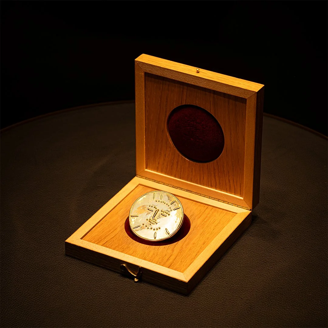 Cast in 23 karat gold and created with François Victor Hugo, this medallion belongs to a rare edition of small sculptures Picasso made to be lived with, not just looked at. Picasso’s medallion brings together two simple ideas: a face and a clock. The face is centered and still, drawn with fine vertical lines, while the border is made up of Roman numerals arranged like the hours of a watch. Time, expression, identity, all held in something one can wear.